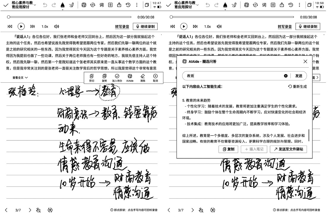 笔身侧边按钮支持自定义设置,可实现圈选擦除、橡皮、画直线、灵动笔等功能。小编建议大家设置为“切换至灵动笔”,它仅限在写作、记录内生效,当你用灵动笔圈选写作或记录中特定的词句,就会弹出一系列功能选项。比如小编选中记录中手写的“教育”两个字,它就弹出了剪切、复制、加入待办、AI 大模型问答以及清除的选项。