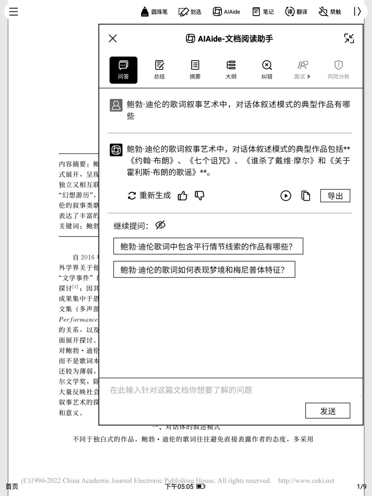 针对这篇论文的内容,你还可以对 AI 文档助手进行开放式的提问,它都能进行回答,比如小编问“鲍勃・迪伦的歌词叙事艺术中,对话体叙事模式的典型作品有哪些”,它很快根据论文的内容举出了四个例子,答案都是正确的。
