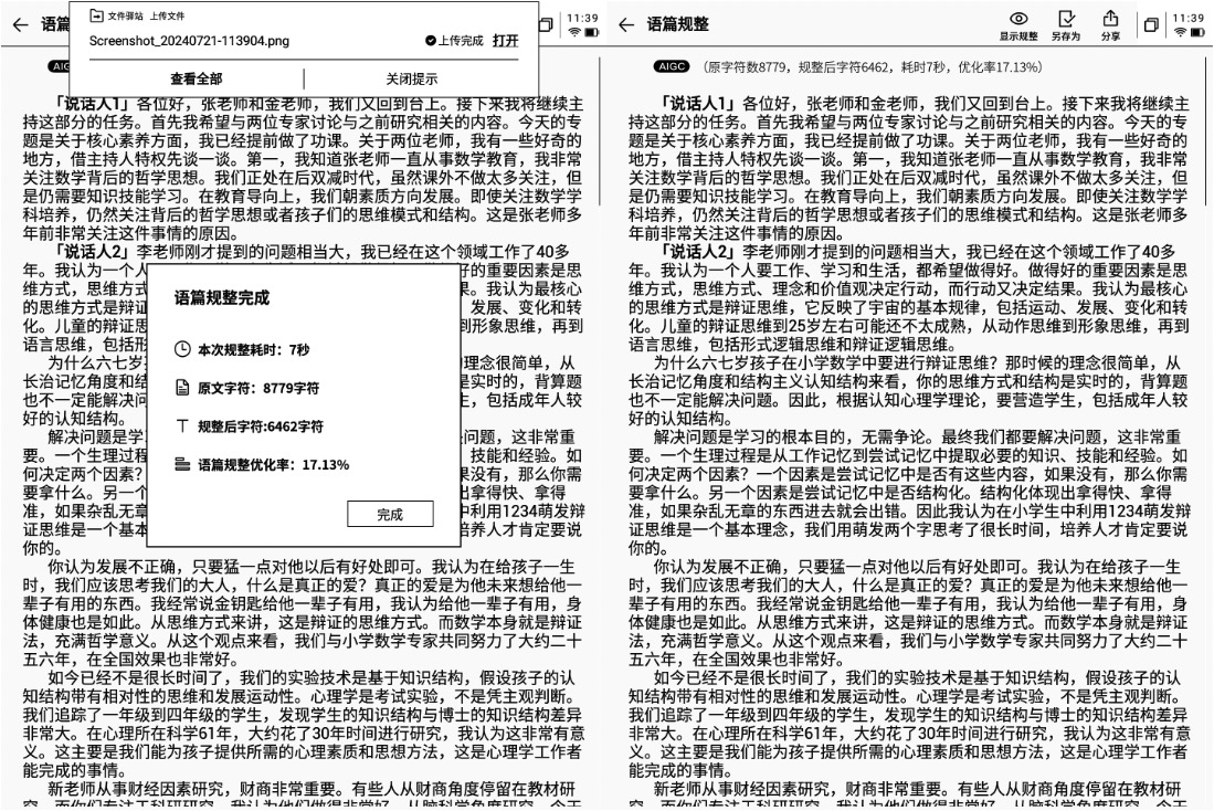 还有语篇规整功能。我们知道,开会的时候说话人往往有很多语气词、停顿以及语义重复的内容,当我们整理文稿时,光是剔除这部分内容、重新整理语义就很麻烦。而在办公本 Air 2 上,这些工作也可以交给 AI 来完成。