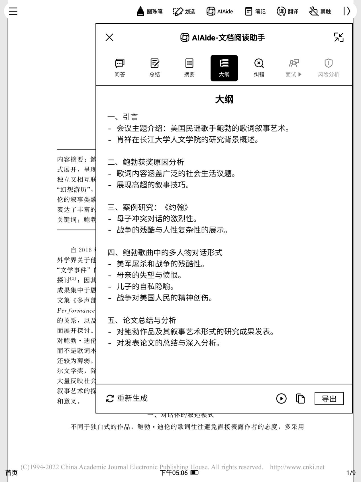 测试时,IT之家让办公本 Air 2 对一篇关于鲍勃・迪伦歌词叙事艺术研究的论文进行总结,这篇论文一共 9 页,办公本 Air 2 只用了大概 20 秒的时间就完成了分析,并给出了精简的论文内容总结: