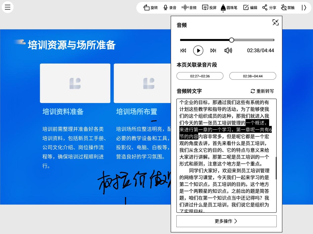 比如,很多职场人经常需要参加各种培训,培训听课过程中,你可以提前把课件放进办公本,培训时打开文档,随着老师讲课,可以实时录音,转写文字,还能同时手写。培训结束,每页 PPT 对应说了什么内容,都录下来了,对于日后回顾培训的内容非常有帮助。