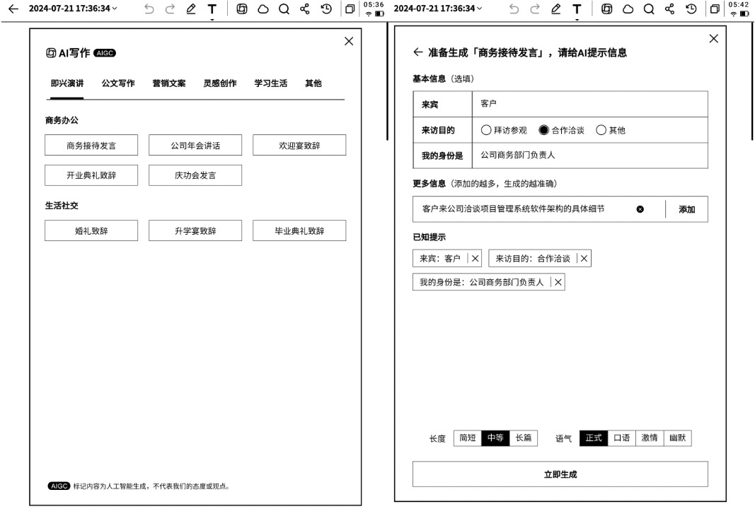 除了帮你“读”,讯飞智能办公本 Air 2 甚至还能帮你“写”,在工作中,有时候各种公文、讲稿、周报月报之类的也很让人头疼,而办公本 Air 2 内置了 AI 智能写作功能,可以帮你轻松撰写这类文稿,包括商务发言、工作汇报、推广文案、文学创作等等,都能写。