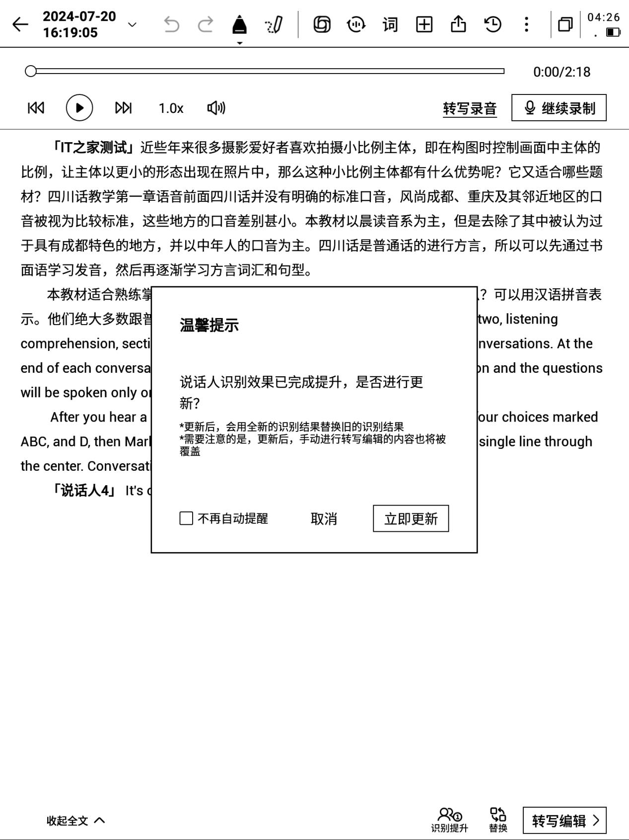 正因如此,在录上面这段内容时,办公本 Air 2 才会自动将小编说话的声音判断为说话人“IT之家测试”。