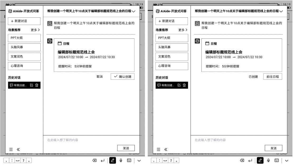 比如小编让它帮我创建一个明天上午 10 点关于编辑部标题规范的线上会,它就能直接帮我在办公本 Air 的日程管理界面中创建好。