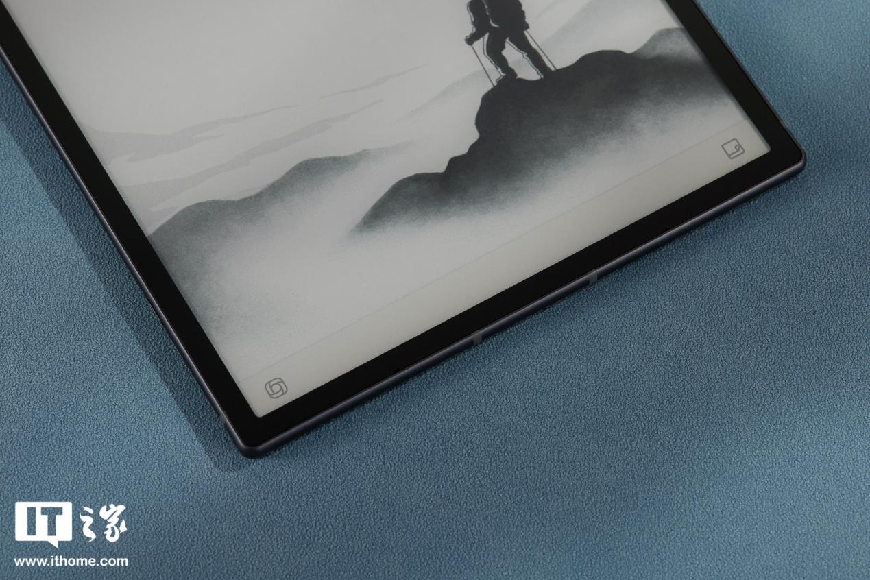 在产品外观上,办公本 Air 2 也延续了上一代的设计风格,深空灰色的铝合金金属机身,正面的屏幕上方是一排细密的扬声器开孔,下面是 8.2 英寸的柔和墨水屏,屏幕尺寸比上代更大,同时屏幕的黑边也明显比前作更窄了,可达到 88.5% 的视觉屏占比,这也是目前墨水屏领域最大屏占比。