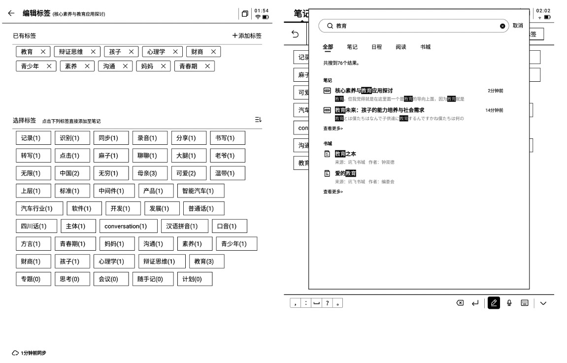 小编设置完后,点击笔记列表界面上方的“标签”图标,选择“教育”标签,它就会帮我关联到我所有笔记中和“教育”有关的内容,甚至书城里和“教育”有关的书籍也能关联到。