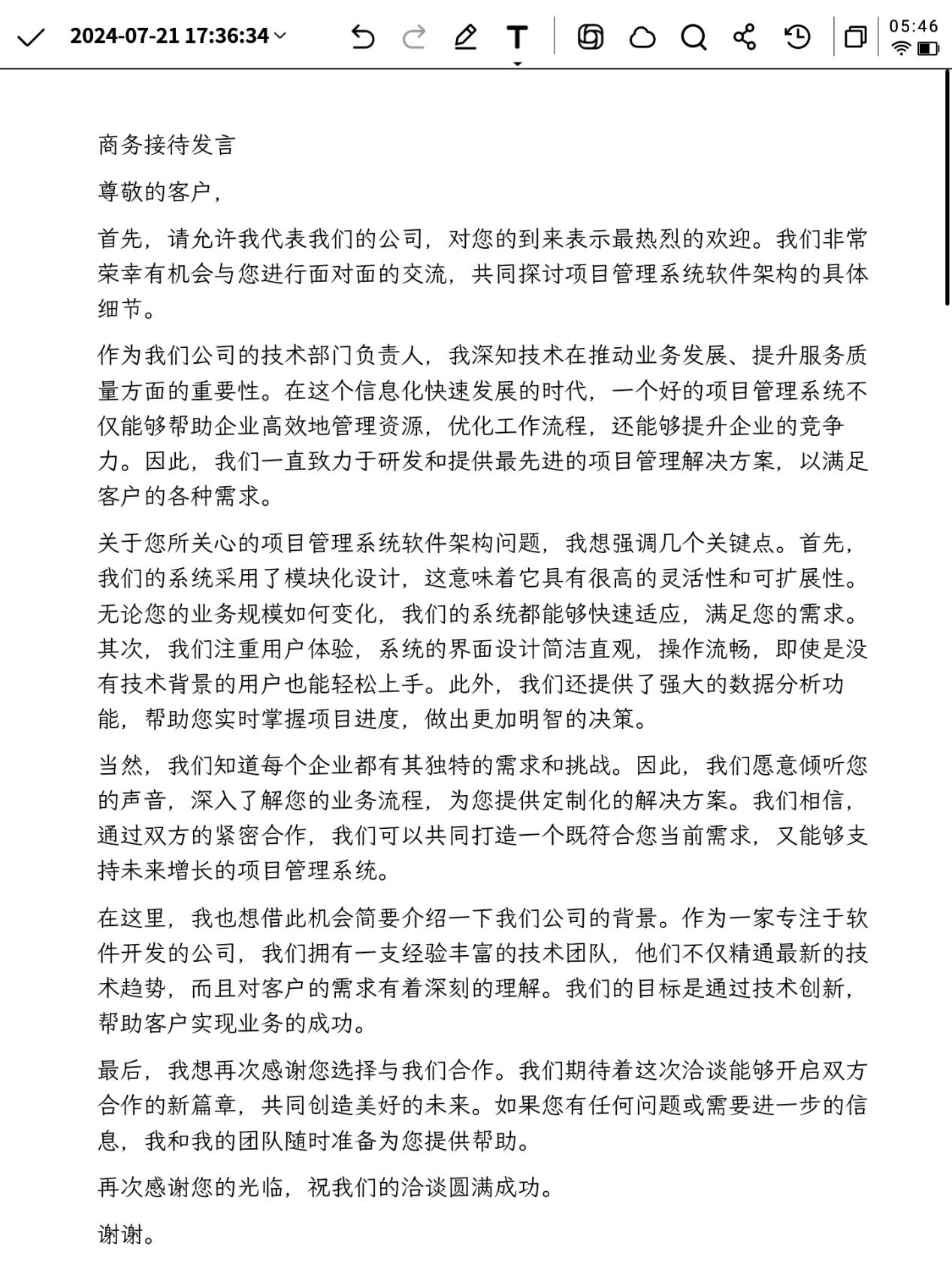 IT之家也对这个功能做了测试,例如小编让它写一篇商务接待的发言稿,只需要填写稿件的相关信息,小编写的主要信息就是“我们以公司技术部门负责人的身份接待客户,商谈和项目关系系统软件架构方面的具体细节”,以此为主题写一份接待发言稿。同时你还可以选择稿件的长度、语气。小编选择的是中等长度、正式口吻。