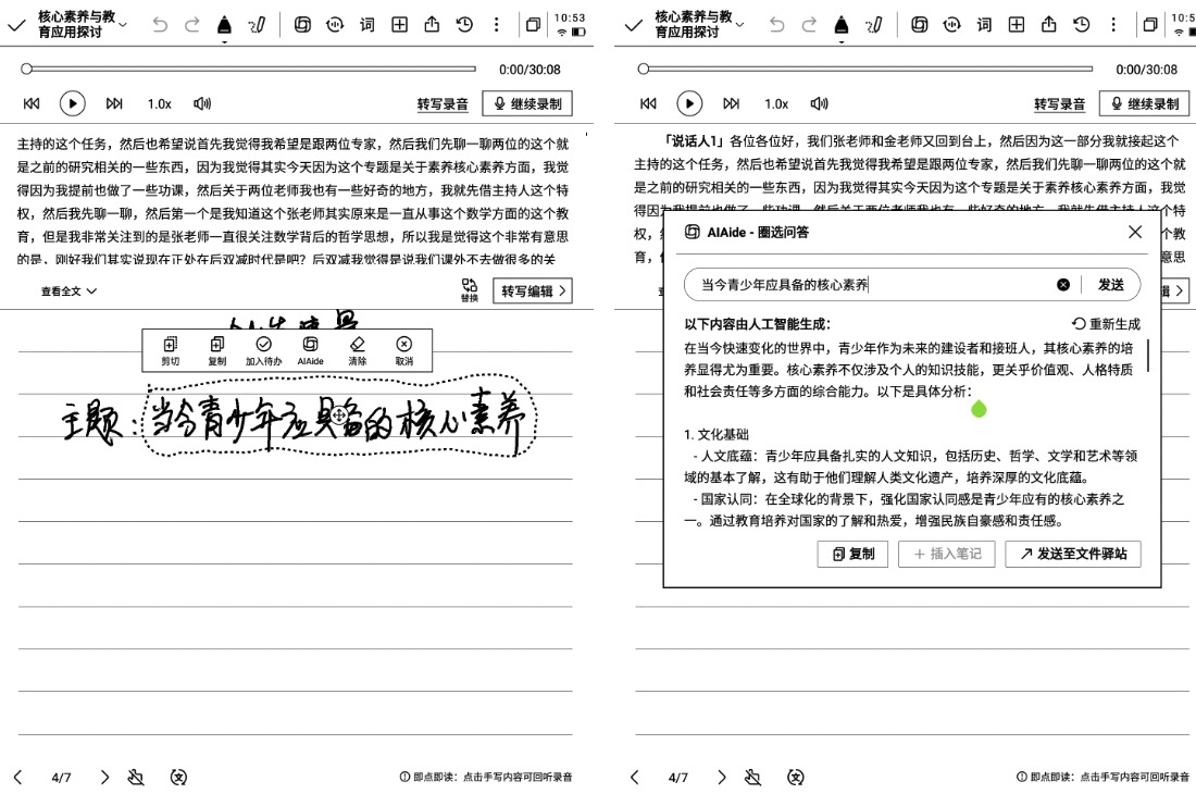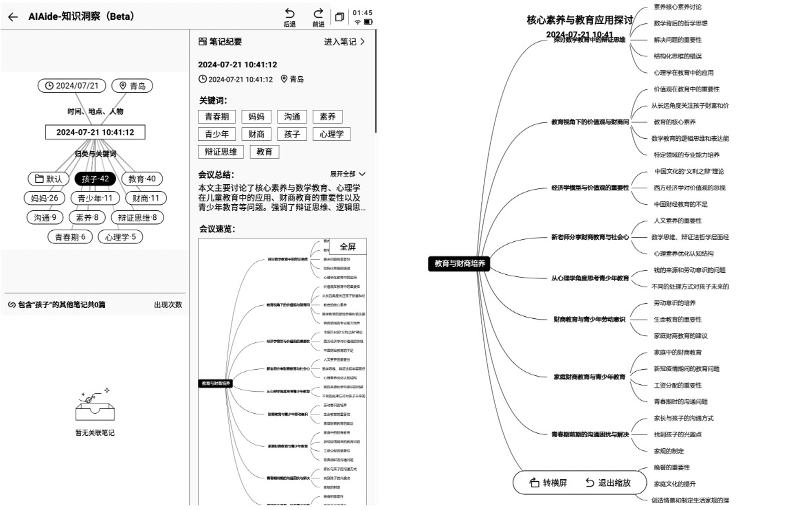 而办公本 Air 2 的星火大模型能力就能帮助大家解决这些问题。在测试时,IT之家录制了一段关于当今社会青少年心理素质教育的圆桌论坛,三个讲话人,大约 30 分钟,让办公本 Air 2 一边录音一边转写,同时自己还用电磁笔记录重点信息,可以看到内容非常冗长。