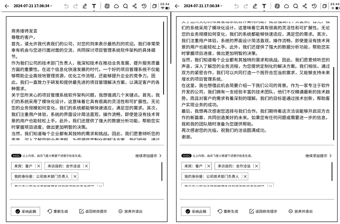 办公本 Air 2 很快就完成了一份符合要求的发言稿,内容非常得体且正式,基本上也是可以直接拿来用的水平。如果你不满意,还可以选择添加新的关键词重新生成。这里小编比较满意,就点击“采纳此稿”。