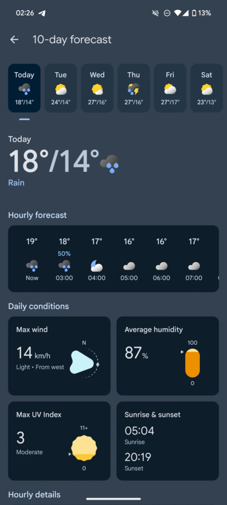 在温度下方,是一些熟悉的信息卡片,提供了所有你期望从天气应用中获得的信息——小时和10天的天气预报、湿度、日出和日落时间、风速、空气质量指数(AQI)、能见度、紫外线指数和气压。一个有趣的新发展是,这些卡片(除了小时预报)可以通过按住并移动来永久重新定位。