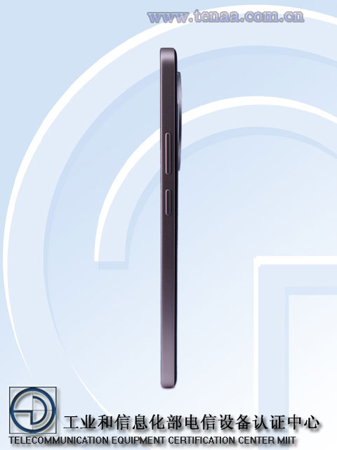 从图上可以看到,realme 真我 RMX5002 手机后置三摄圆形相机模组,采用对称式布局,右下角放置有 1 颗闪光灯。该手机边框采用立边设计,右侧放置音量 +/-按键和电源键。