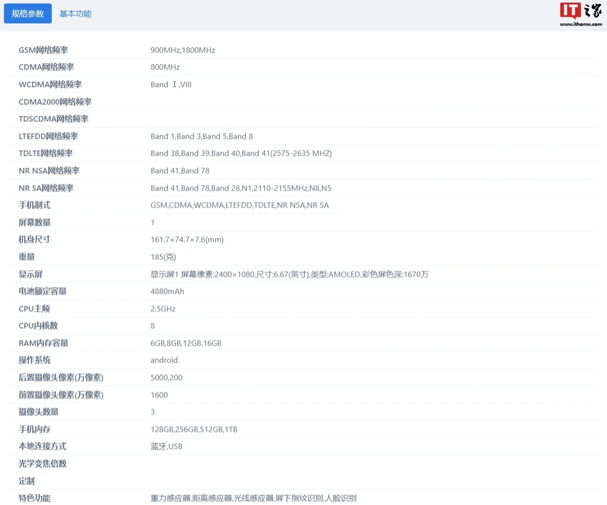 IT之家查询电信设备终端网获悉,这款新机尺寸为 161.7×74.7×7.6mm,重约 185g;配备 6.67 英寸 AMOLED 直屏,分辨率 2400×1080,支持 1670 万色显示。
