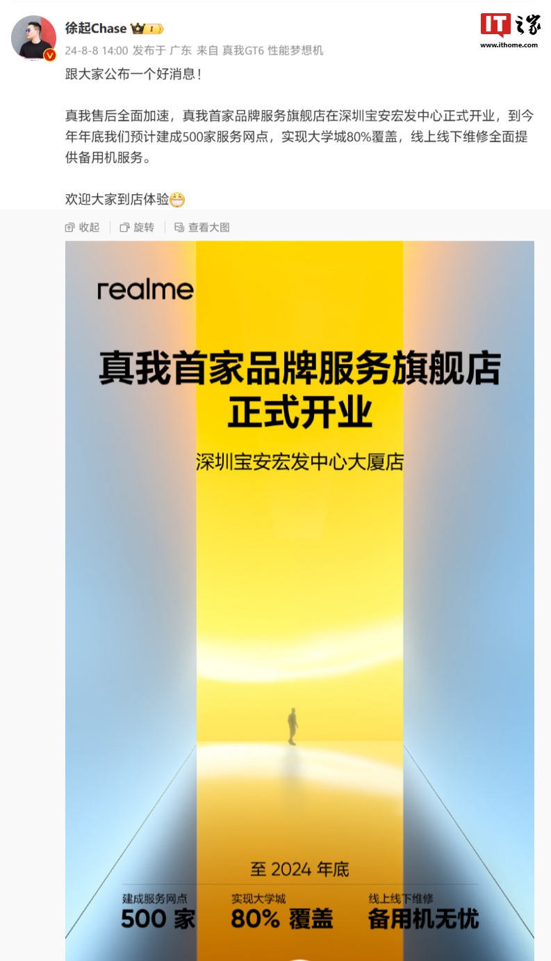 IT之家 8 月 8 日消息,真我 realme 副总裁、全球营销总裁、中国区总裁徐起今天下午在微博发文宣布,真我首家品牌服务旗舰店在深圳宝安宏发中心正式开业。