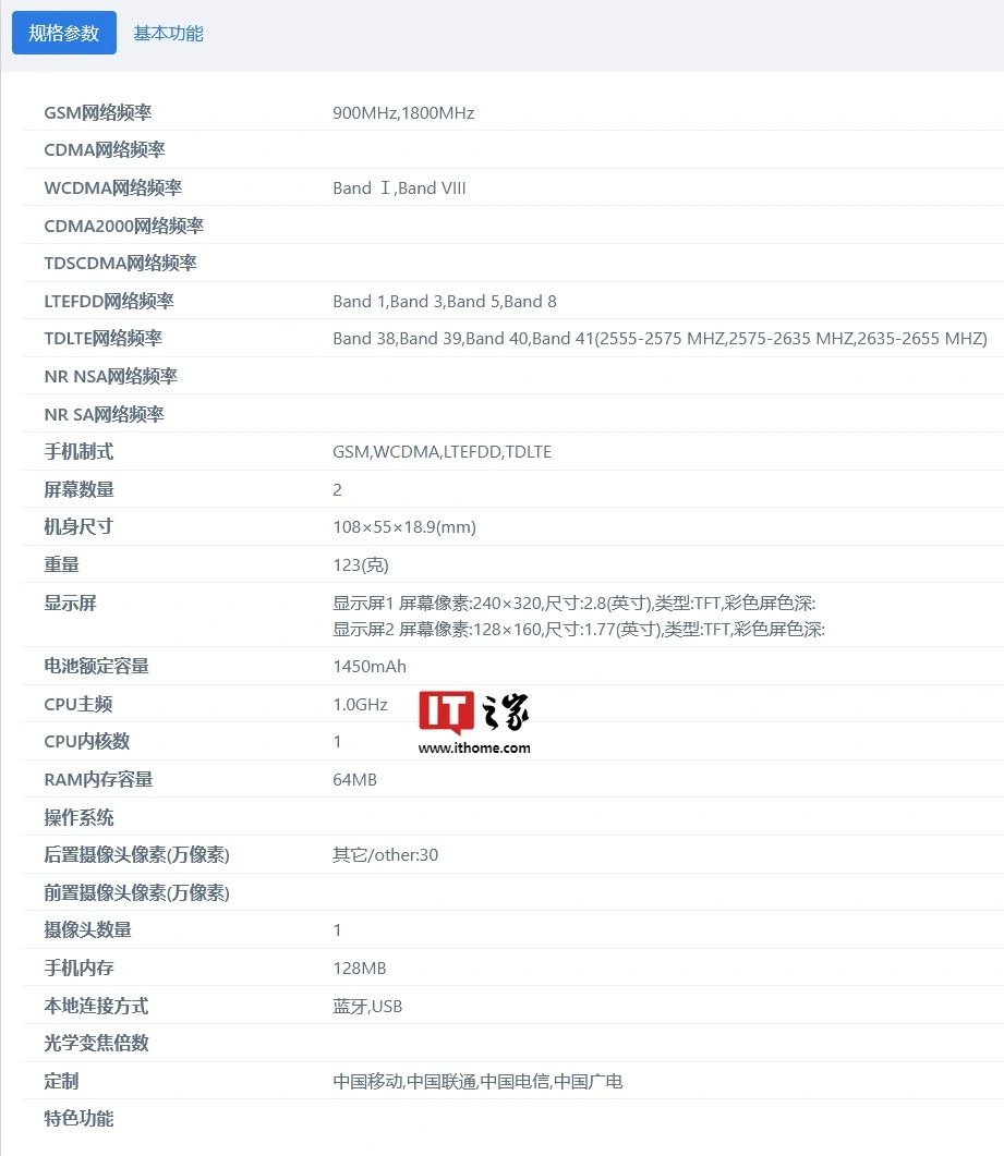该机配备 1450mAh 容量电池,64MB 内存,128MB 存储,30 万后置摄像头,1.05 GHz 单核处理器。