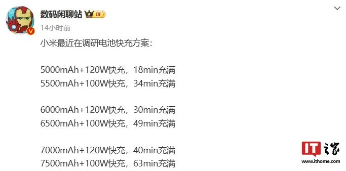 文章来源于互联网:IT之家-消息称小米调研多种电池快充方案,含 7500mAh + 100W 快充等