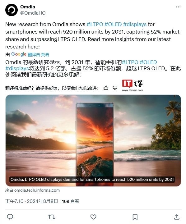 IT之家 8 月 9 日消息,市场调查机构 Omdia 昨日(8 月 8 日)发布报告,预估到 2031 年,用于智能手机的 LTPO(低温多晶氧化物)OLED 屏幕的出货量将增至 5.2 亿片。