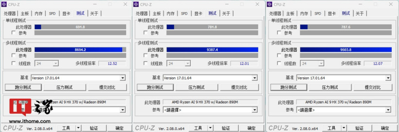 有意思的是官方给到的 CPU 默认 TDP 为 28W,所以我们还通过奥创中心里的手动模式,人为将 CPU 功耗控制在 45W、60W 和 80W 三个档位测试了不同功耗下的性能水平。AMD 锐龙 AI 9 HX 370 处理器在 3 种功耗下的多线程分数分别为 8694 分、9387 分和 9503 分,相比之下酷睿 Ultra 9 在三种功耗下的多线程分数为 7402 分,8389 分和 9136 分,45W 的锐龙 AI 9 HX370 多核分就已经超过了 65W 的 Ultra 9 多核分,能效表现也相当可以。