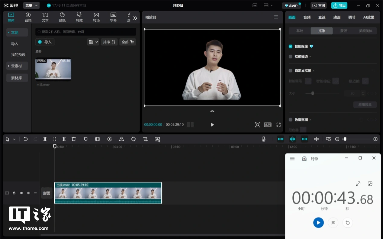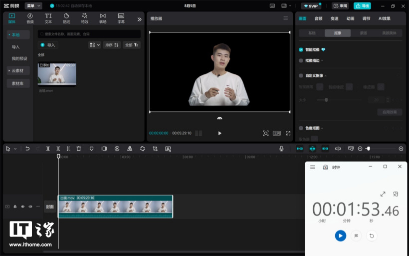 AI 性能上我们通过具有代表性的剪映 PC 版进行测试,在基于本地硬件算力的智能抠像功能上,分别采用集显模式和独显模式下处理一段时长为 5 分 30 分的 4K 分辨率人物出镜拍摄素材,AMD Radeon 890M 核显最终耗时 1 分 53 秒完成了抠像,对比很多轻薄本上动辄 4、5 分钟的处理时间优势明显,而通过 RTX 4060 的 CUDA 加速进行处理,耗时 43s 完成,属于主流水平。
