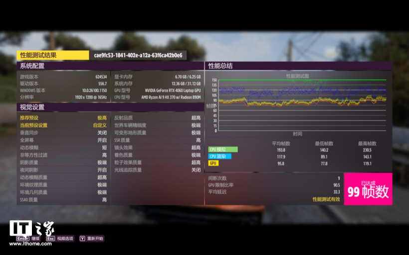 再来是优化出色的赛车游戏《极限竞速:地平线 5》,1200P + 极端画质,关闭光追的情况下,运行游戏自带基准测试,平均帧数为 99 帧,1% Low 帧为 77 帧。作为对比,酷睿 Ultra 9+RTX 4060 的平均帧数为 92 帧,1% Low 帧为 75 帧。