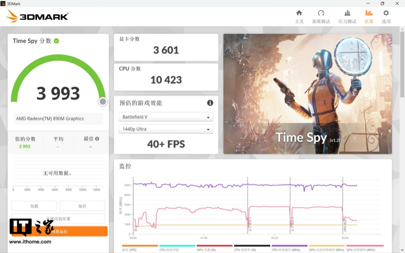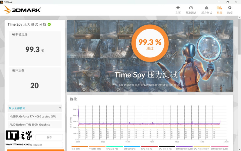 而在 Time Spy 压力测试环节,显卡的帧率稳定度表现达到了 99.3%。