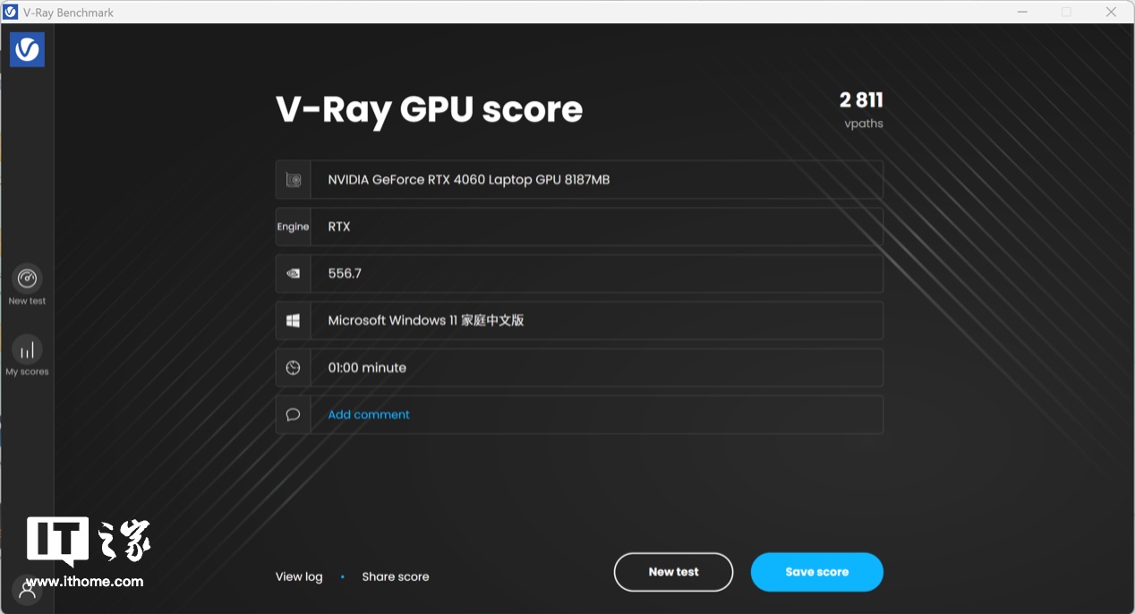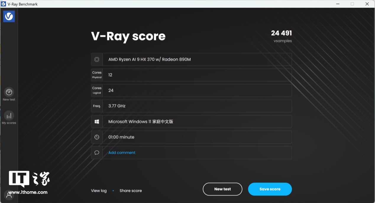 在专业渲染设计工具 V-Ray BenchMark 6 测试中,锐龙 AI 9 HX 370 的 CPU 成绩来到了 24491 分。GPU CUDA 成绩为 1835 分,GPU RTX 成绩为 2811 分。