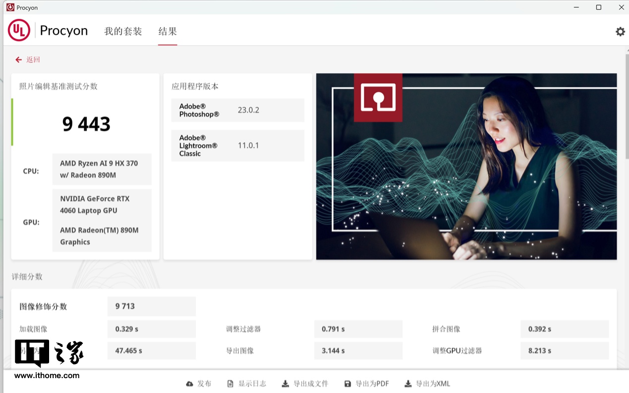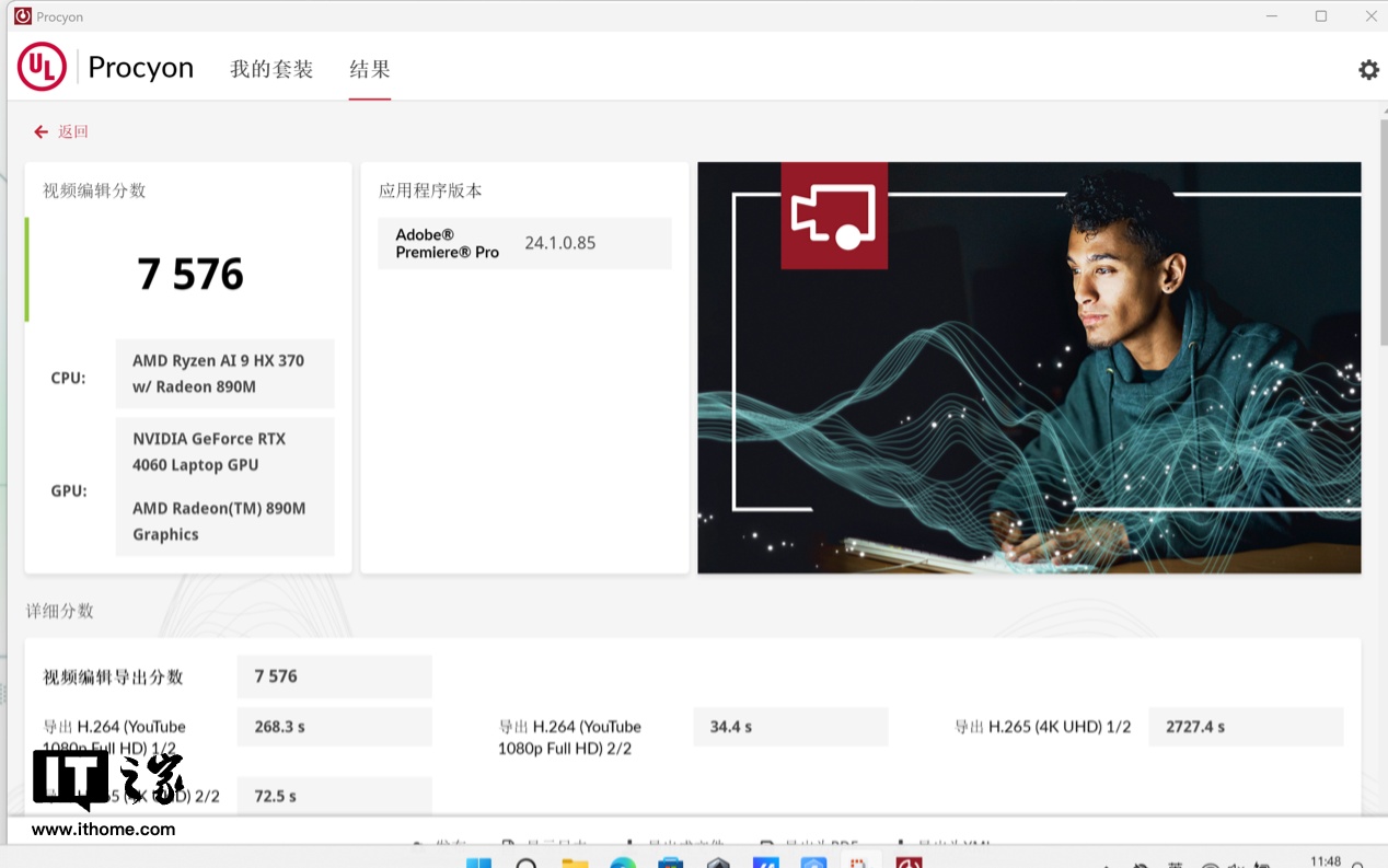 在 UR Procyon 中基于 Photoshop 和 Lightroom 的照片编辑基准测试中,综合分达到了 9443 分,而在基于 Premiere Pro 的视频编辑基准测试中,综合分数为 7576 分。这几组成绩足以说明,华硕天选 Air 2024 能够胜任各类专业创作生产力工具。