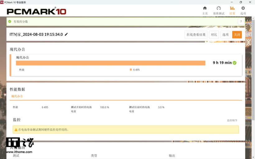 我们通过 PC Mark 10 现代办公续航基准测试测得的理论续航成绩为 9 小时 19 分,测试条件为安静性能模式 + 集显输出,50% 屏幕亮度,这样的续航水平配合 14 英寸的机身,表现较为出色。