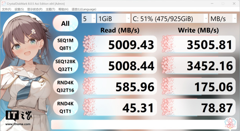 原装固态硬盘的具体读写性能表现如图所示,读取速度 5000MB/s 左右,写入速度 3500MB/s 左右,该结果是在 50% 脏盘情况下跑出的数据,给到大家参考。