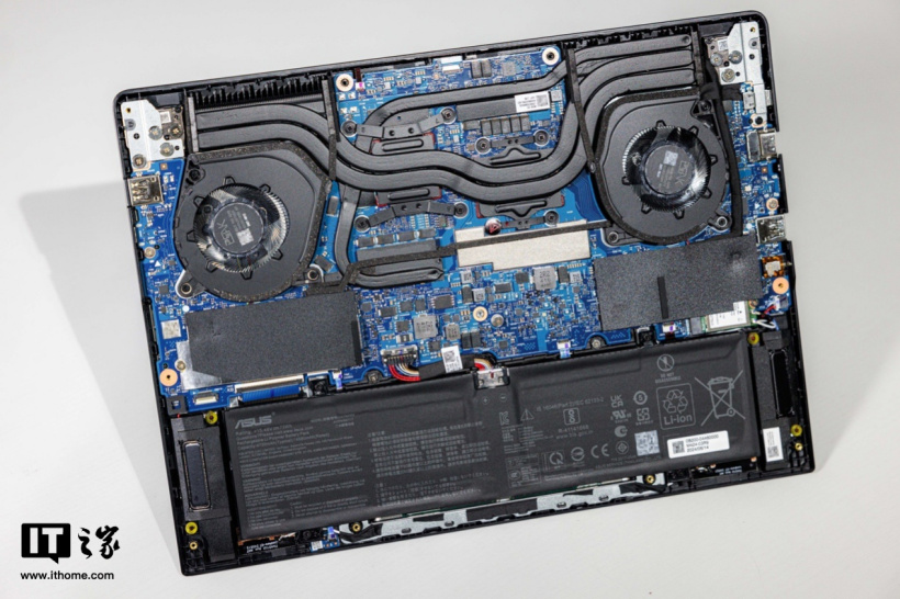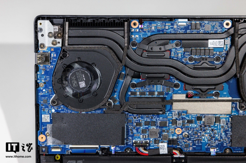 按惯例先拆机,华硕天选 Air 2024 的拆机比较简单,拧下 D 壳表面的螺丝,其中右下角的螺丝固定在 D 壳上,拧松会自动顶起一条缝,沿着缝隙依次翘起卡扣即可取下 D 壳。华硕天选 Air 2024 内部采用了双风扇 + 三热管的散热设计。