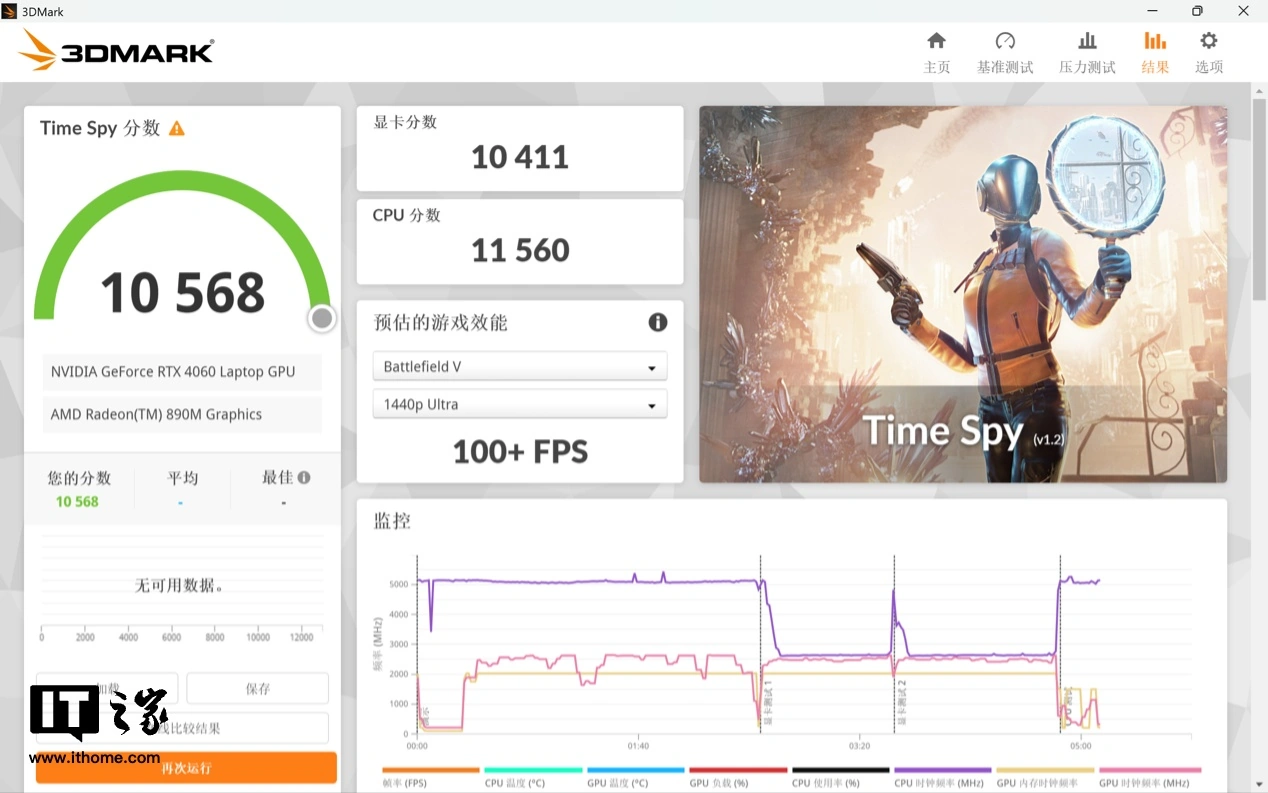 再来是 GPU 表现,100W 功耗的 RTX 4060 在 Time Spy 测试中跑出了 10411 分的显卡分数。