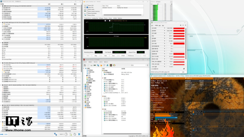 最后是双烤测试,烤机 20 分钟后,CPU 功耗维持在 35W 左右水平,CPU 温度相比单烤时下降了不少,只有 72.5 度左右。GPU 方面则可以保持 75W 的功耗,GPU 主频降到了 1800MHz 左右,GPU 温度和单烤时差不多,在 75 度左右,显存温度为 68 度。如此看来,华硕天选 Air 2024 的整机性能释放可达 110W。