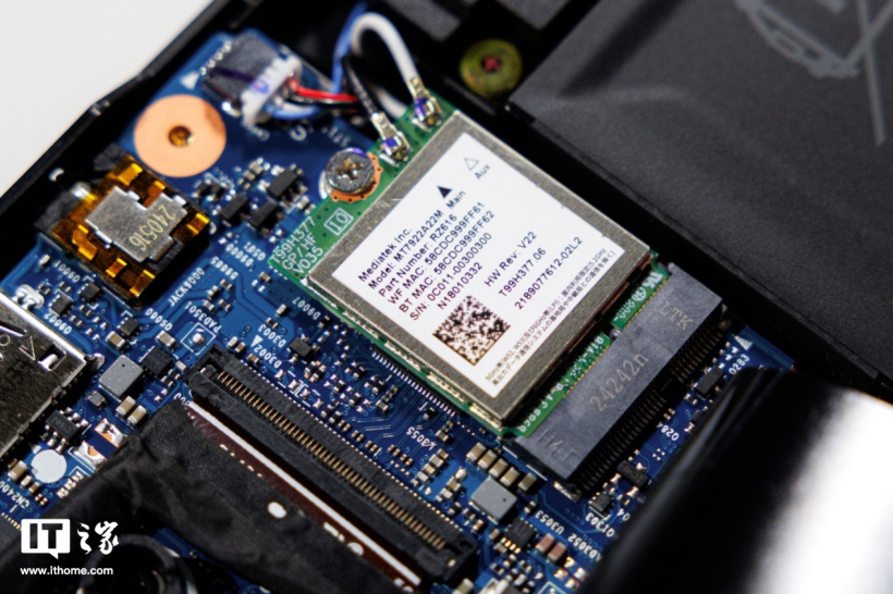 中间的 M.2 硬盘位右侧还有一个 Mediatek MT7922 Wi-Fi6E 无线网卡。