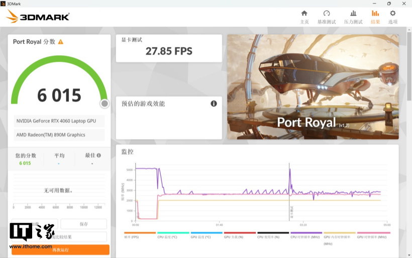 在针对实时光线追踪的 3D Mark Port Royal 测试中获得了 6015 分的成绩。