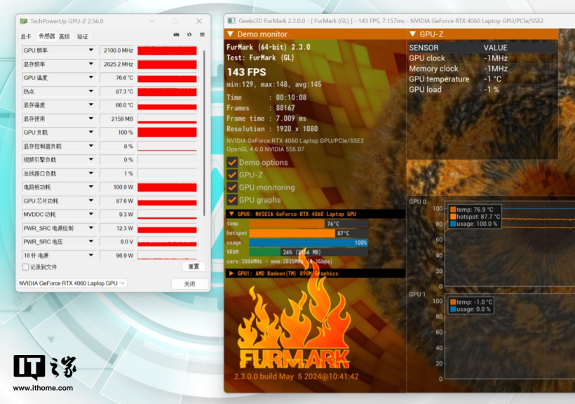 单烤 GPU 环节,10 分钟烤机后 GPU 功耗维持在 100W 水平,GPU 温度 76.6 度,显存温度较低,只有 66 度,而此时的 CPU 主频稳定在 2100MHz。