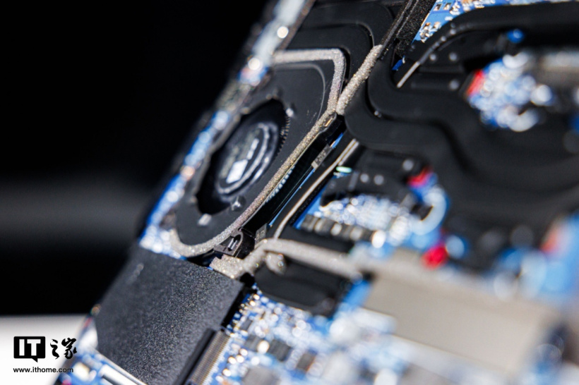 两个风扇外壳的内侧各做了一条开口,便于风扇将机身内部热空气向后吹往出风口,从而排出机身,也就是典型的内吹式设计。