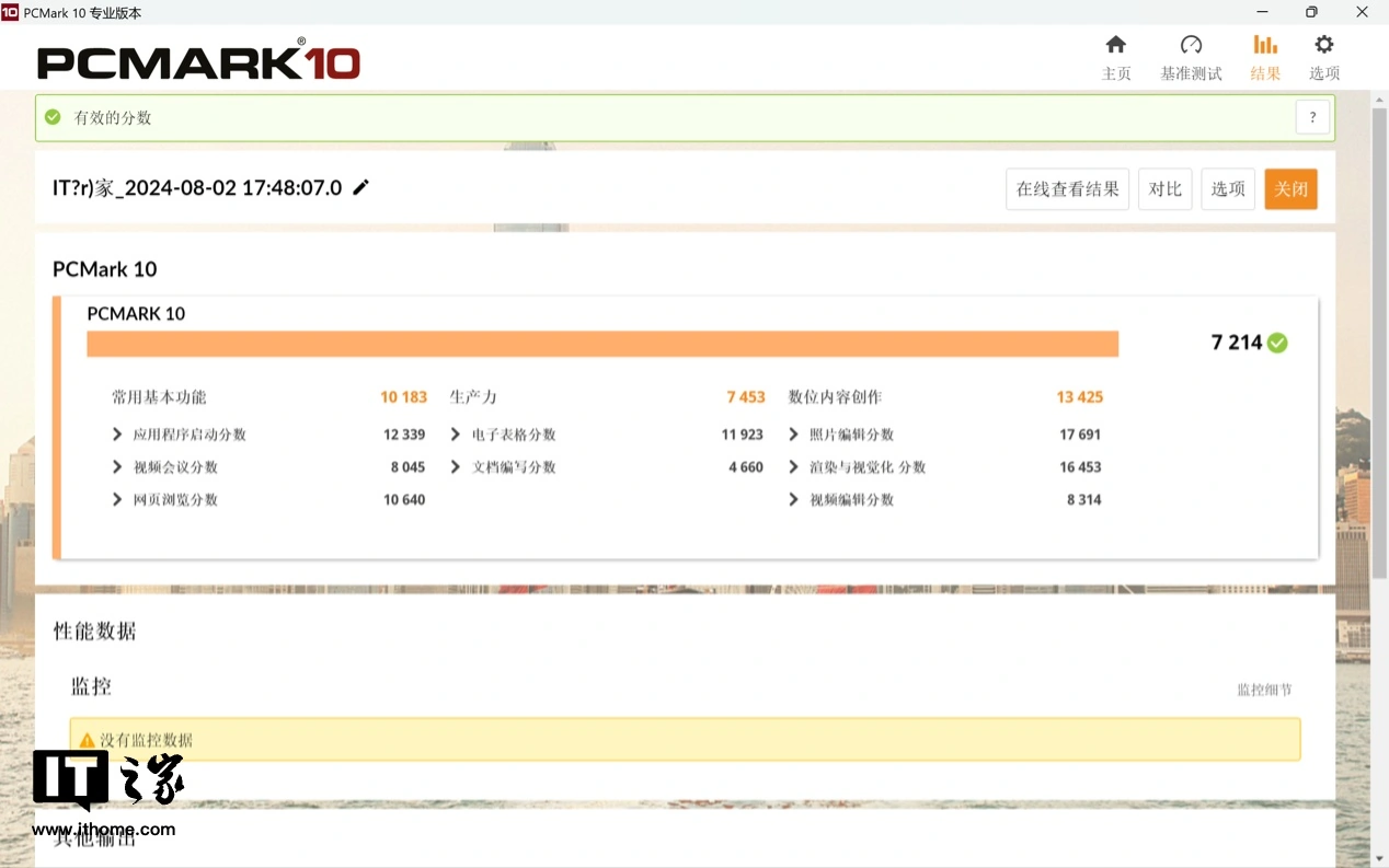 首先看生产力,在 PC Mark 10 现代办公基准测试中,华硕天选 Air 2024 的综合分数为 7214 分,3 个子项目分数中数位内容创作得分最高,应付日常基本办公毫无压力。