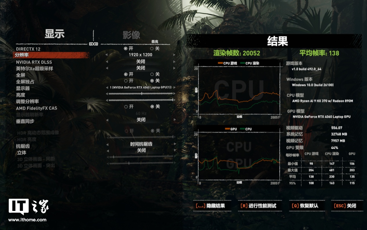 在经典光栅游戏《古墓丽影:暗影》中,1200P + 最高画质设置下,运行游戏自带基准测试,平均帧数为 138 帧,1% Low 帧为 85 帧。作为对比,酷睿 Ultra 9+RTX 4060 的平均帧数为 130 帧,1% Low 帧为 78 帧。