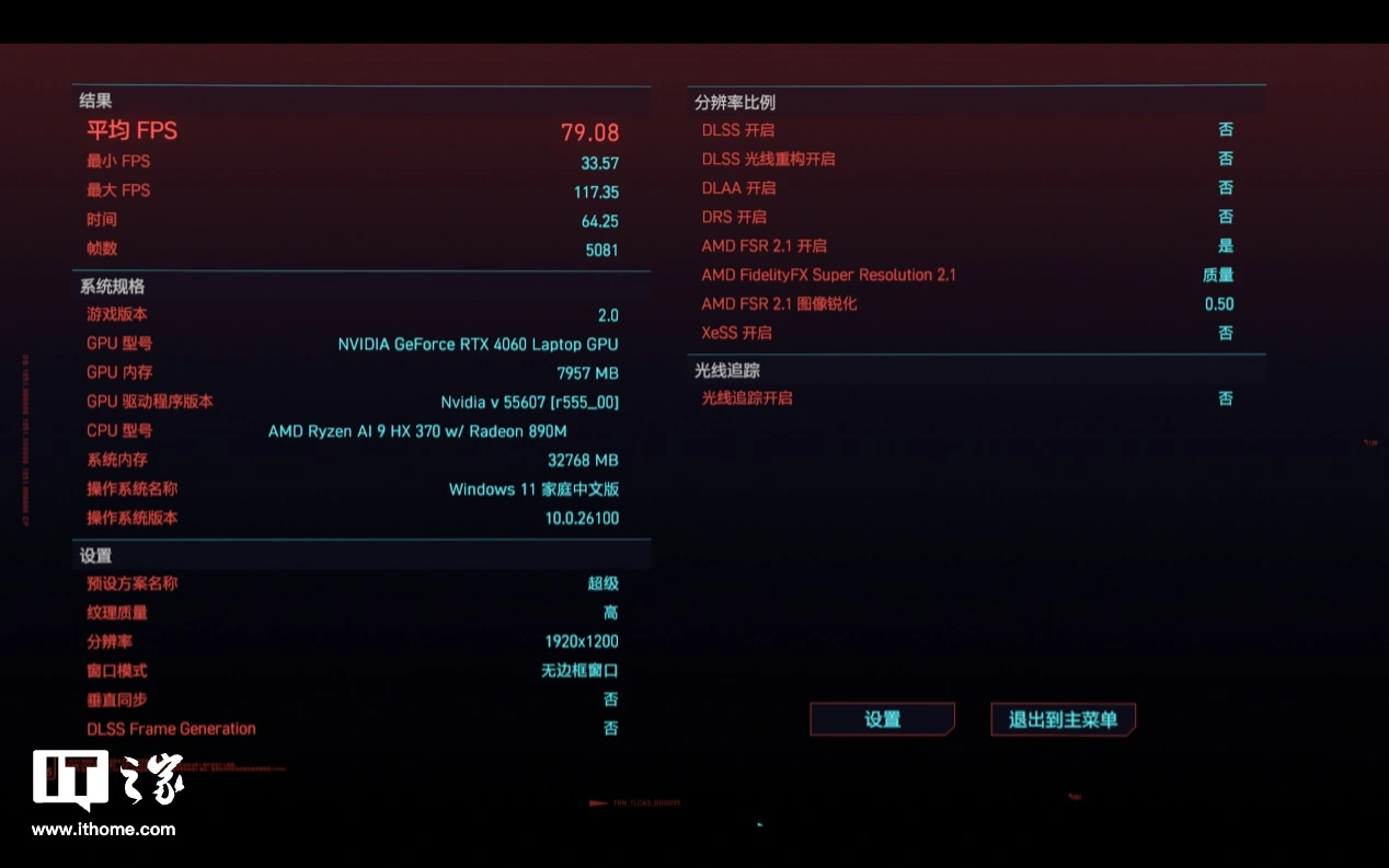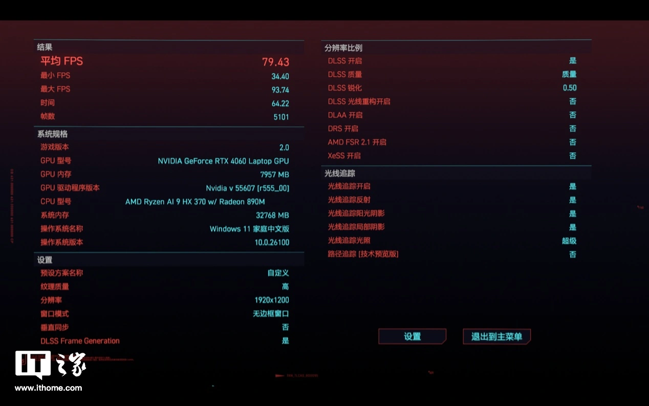 开启超级光追画质,并选择 DLSS 质量档 + DLSS 3,游戏的平均帧数恰好也是 79 帧,1% Low 帧为 34 帧,此时相比酷睿 Ultra 9+RTX 4060 平台的帧数差距只有一两帧,可以忽略不计。虽说在搭配同功耗 RTX 4060 显卡的情况下,锐龙 AI 9 HX 370 处理器与酷睿 Ultra 9 实际的游戏平均帧数差距基本不会超过 10 帧,但总体而言锐龙 AI 9 HX 370 处理器还是始终保持着优势。