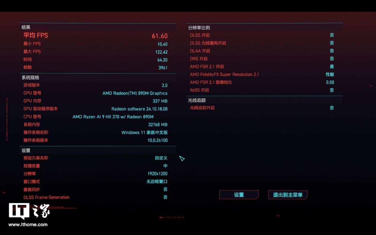 那么如果单看 890M 核显,表现又如何呢?我们也通过两款游戏简单测试了一下,《赛博朋克:2077》中,使用 1200P + 中等画质预设,FSR2.1 选择性能档,游戏平均帧数可以来到 61 帧,1% Low 帧为 30 帧。酷睿 Ultra 9 的 Intel ARC 核显 + XeSS 游戏平均帧数跑到了 47 帧,1% Low 帧为 31 帧。890M 核显的领先幅度达到了 29%。