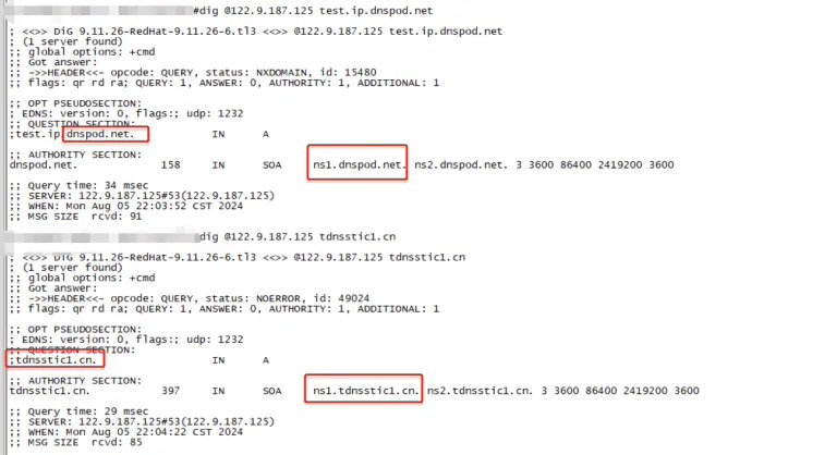 二、间歇性存在大量域名无法正常解析的问题,返回 NXDOMAIN+ 错误的 SOA 记录,而不是返回正常的 A 记录或者 CNAME 记录。可执行命令检查:dig @122.9.187.125 test.ip.dnspod.net。其中 122.9.187.125 为示例 IP 地址,您可将其替换为您的家用路由器 DNS 服务器的 IP 地址。