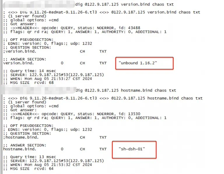 三、DNS 版本为 unbound 1.16.2。可执行命令检查:dig @122.9.187.125 version.bind chaos txt。其中 122.9.187.125 为示例 IP 地址,您可将其替换为您的家用路由器 DNS 服务器的 IP 地址。