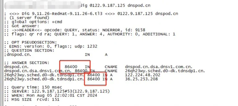 一、域名解析记录 TTL 被修改为 86400 秒,即域名解析记录都会被缓存 1 天。可以在一台能访问公网的终端(如 Mac 电脑或者 Linux 云服务器)中执行命令检查:dig @122.9.187.125 dnspod.cn。其中 122.9.187.125 为示例 IP 地址,您可将其替换为您的家用路由器 DNS 服务器的 IP 地址。