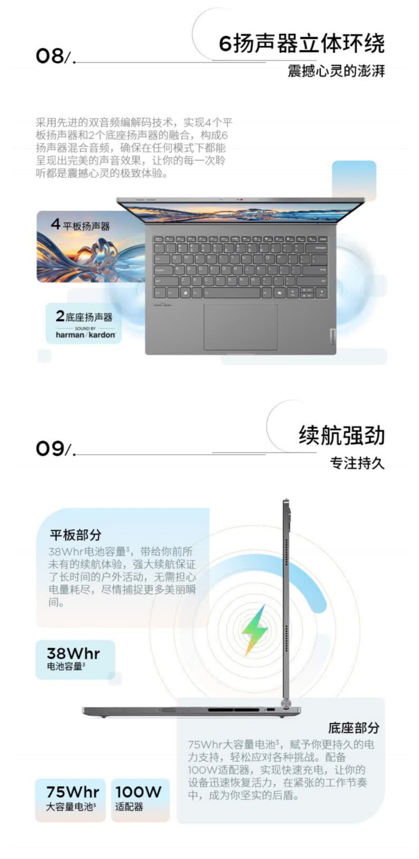 ThinkBook Plus Hybrid 平板为 4 扬声器、底座另有双扬声器;平板电池容量 38Whr、底座电池容量 75Whr,配备 100W 适配器。