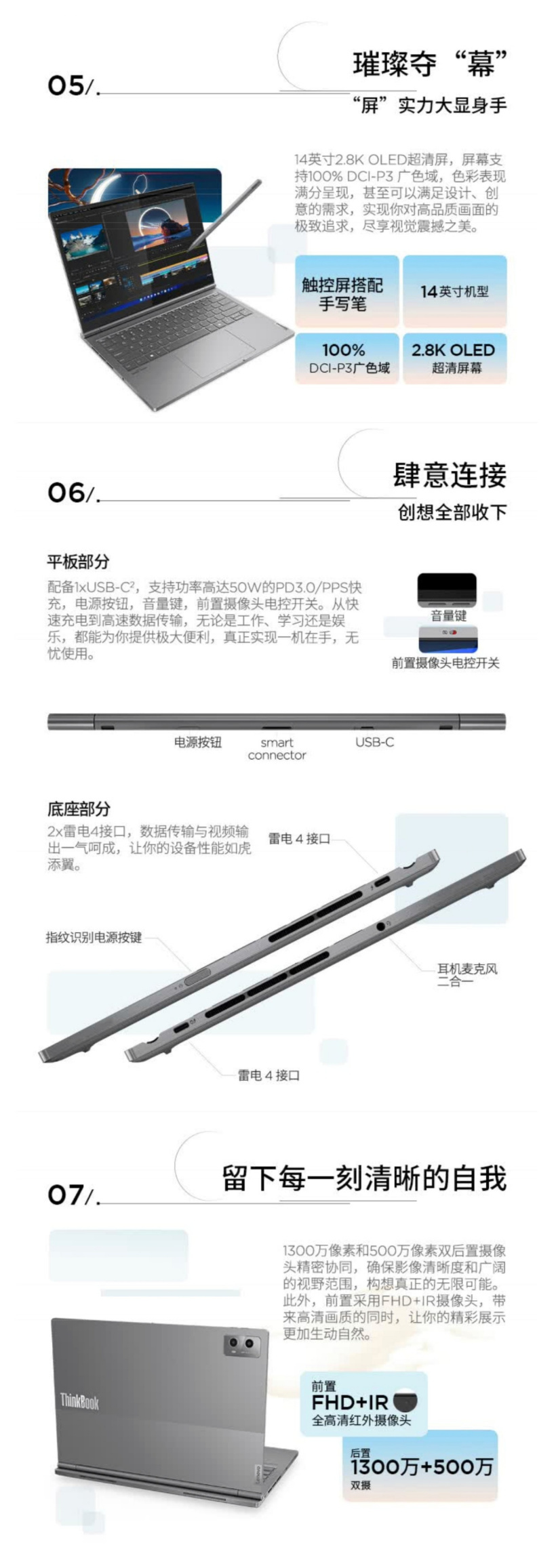 ThinkBook Plus Hybrid 搭载 14 英寸 2.8K OLED 触控屏,支持手写笔,覆盖 100% DCI-P3 色域;平板部分配备 1 个 USB-C 接口,支持 50W PD / PPS 快充;底座部分电源键集成指纹识别,有两个雷电 4 接口和一个 3.5mm 接口;前置 FHD+IR 红外摄像头,后置 1300 万 + 500 万像素双摄。