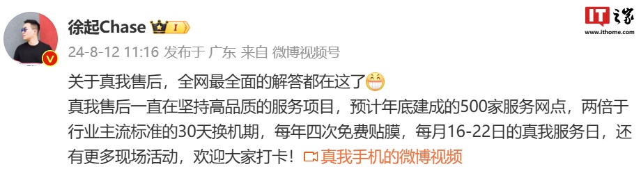 据IT之家此前报道,徐起 2023 年宣布真我售后服务进行“全面战略升级”,目标是实现服务网点 100% 覆盖地级市,平均寄修时效小于 3 天,以及无指纹交付。