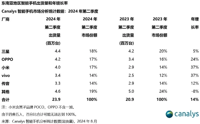 文章来源于互联网:IT之家-Canalys:2024 年 Q2 东南亚智能手机出货量 2390 万台、同比增长 14%,三星、OPPO、小米前三