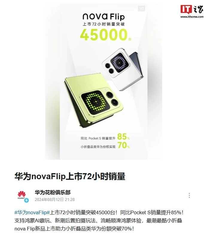 华为官方昨日发文宣布:nova Flip 小折叠屏手机上市 72 小时销量突破 4.5 万台,同比 Pocket S 折叠屏手机销量提升 85%。