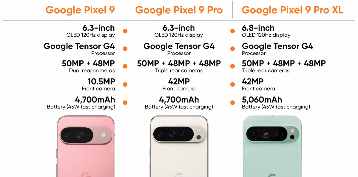 谷歌 Pixel 9 Pro XL 相比 9 Pro 尺寸更大(6.8 英寸),分辨率更高(1344×2992 相对 1280×2856),还拥有 5,060mAh 电池和更快的 45W 快充(功率相同,但电池更大的 XL 可以在 30 分钟的时间内充至 70%),其他方面几乎完全相同。