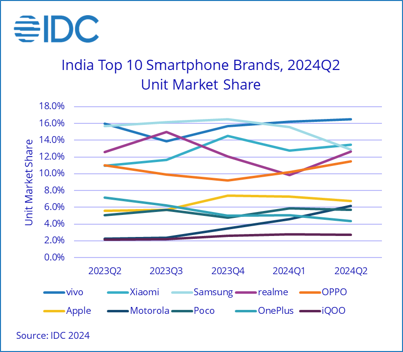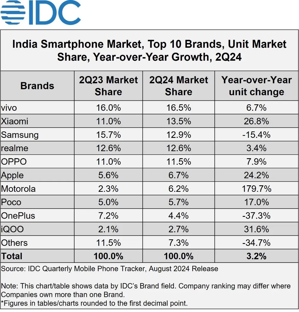 文章来源于互联网:IT之家-印度智能手机市场 2024Q2 同比增长 3.2% 达 3500 万部,vivo 小米三星前三