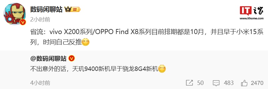 IT之家 8 月 14 日消息,博主 @数码闲聊站 今日发文透露:vivo X200 系列 / OPPO Find X8 系列手机目前排期为 10 月,并且早于小米 15 系列手机。